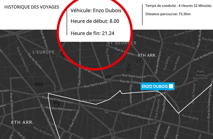 Chaque jour, les véhicules de votre flotte ont un travail à effectuer, à un certain endroit et à une certaine heure. Pour vous assurer que vos véhicules sont toujours là où ils sont censés l’être, notre système puissant de suivi des véhicules vous alerte automatiquement si des véhicules sont utilisés en dehors des heures de travail.